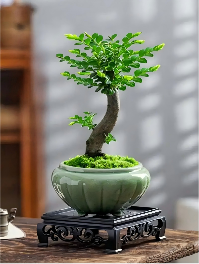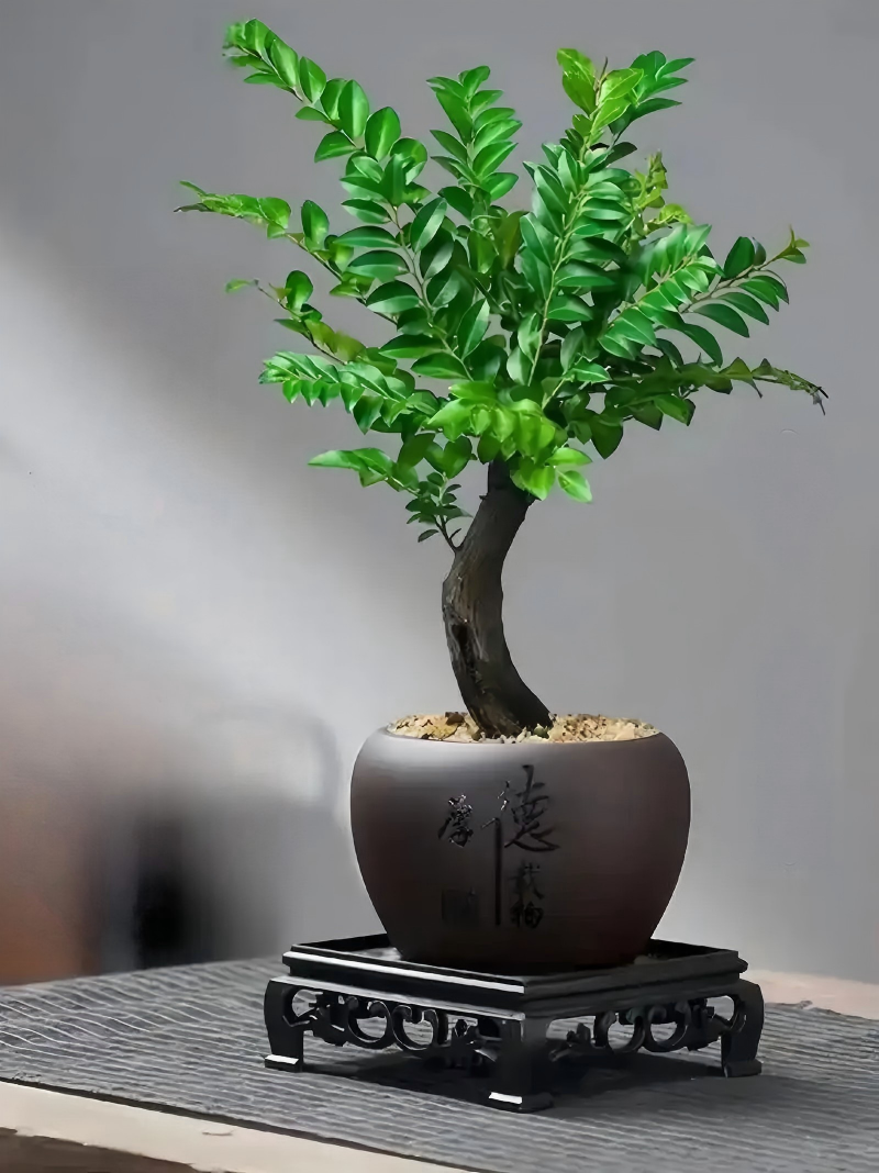 小叶紫檀木质致密,叶色深绿,整体造型沉稳大气。它不仅具有文化象征意义,更能有效净化空气,为办公室营造高雅尊贵的商务氛围。